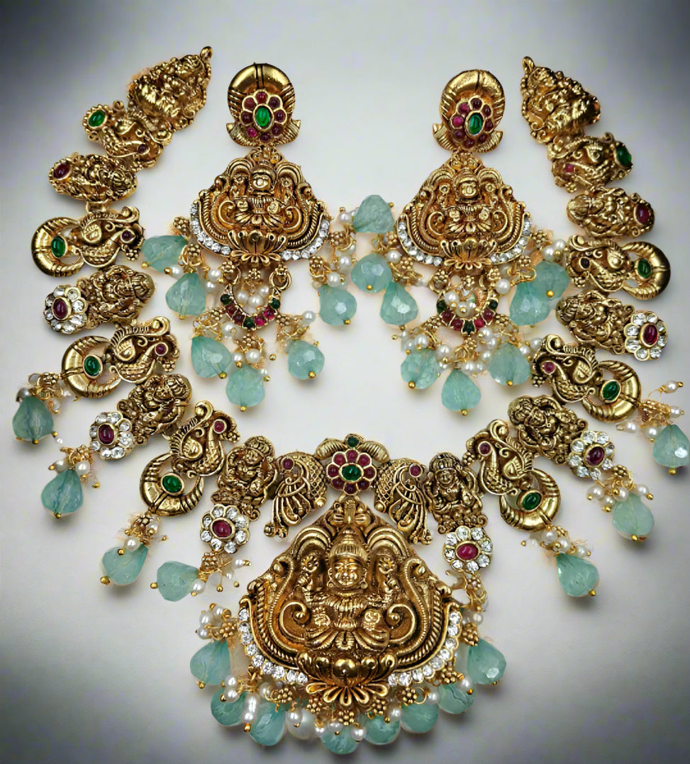 Celebrate timeless divinity and regal charm with our Lakshmi & Peacock Grand Necklace. Adorned with intricate carvings, temple-inspired motifs, and antique gold finish, this masterpiece reflects tradition, power, and opulence — a perfect heirloom for bridal elegance and festive splendor