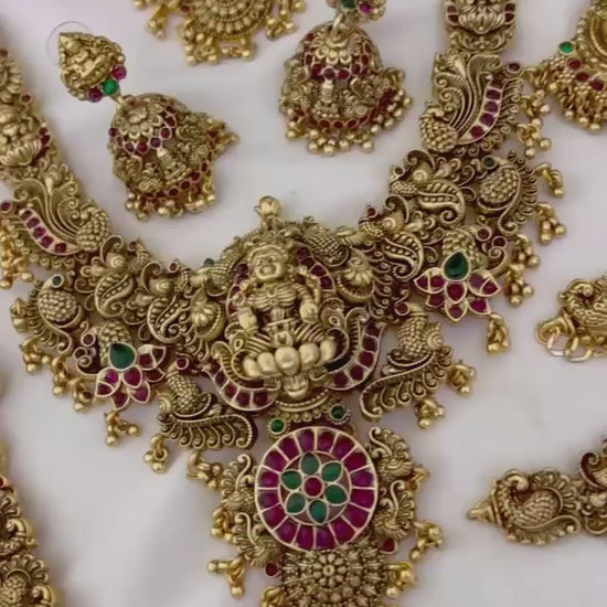 Bring your bridal dreams to life with this handcrafted Matt Finish South Indian Bridal Jewelry Set, inspired by divine temple motifs and rich traditional designs.