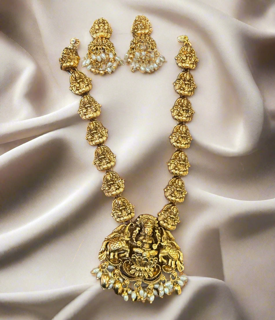 Premium Antique Lakshmi Temple Necklace with Pearl Jhumkas