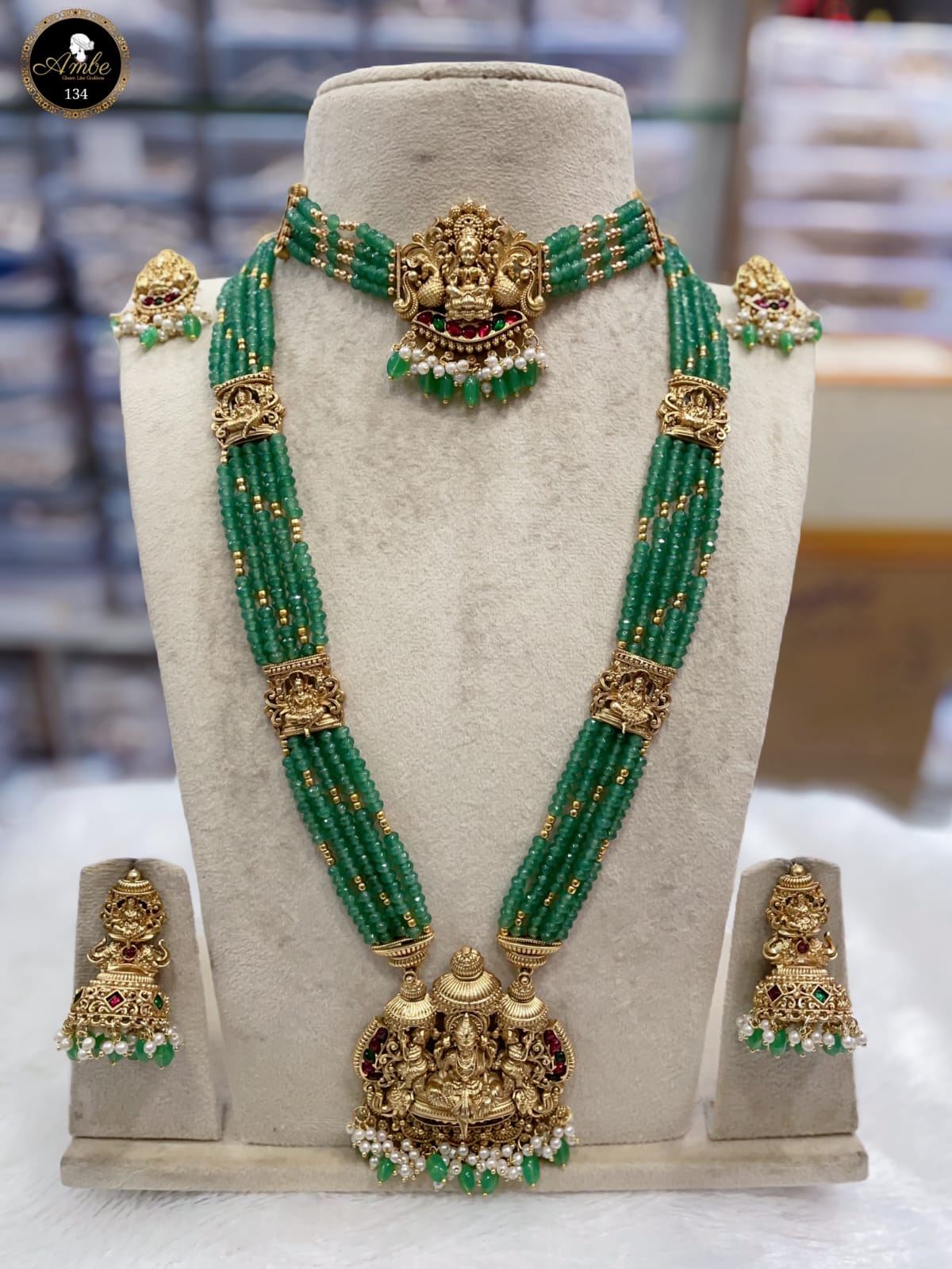 Make a divine statement on your big day with this Lakshmi bridal necklace set, adorned with elegant green beads and majestic peacock motifs. Designed in traditional South Indian temple jewelry style, this set features a beautifully detailed Lakshmi Devi pendant seated under a canopy, symbolizing prosperity and blessings. Flanking the goddess are intricately carved peacocks—emblems of grace and beauty—adding a royal touch to the design.