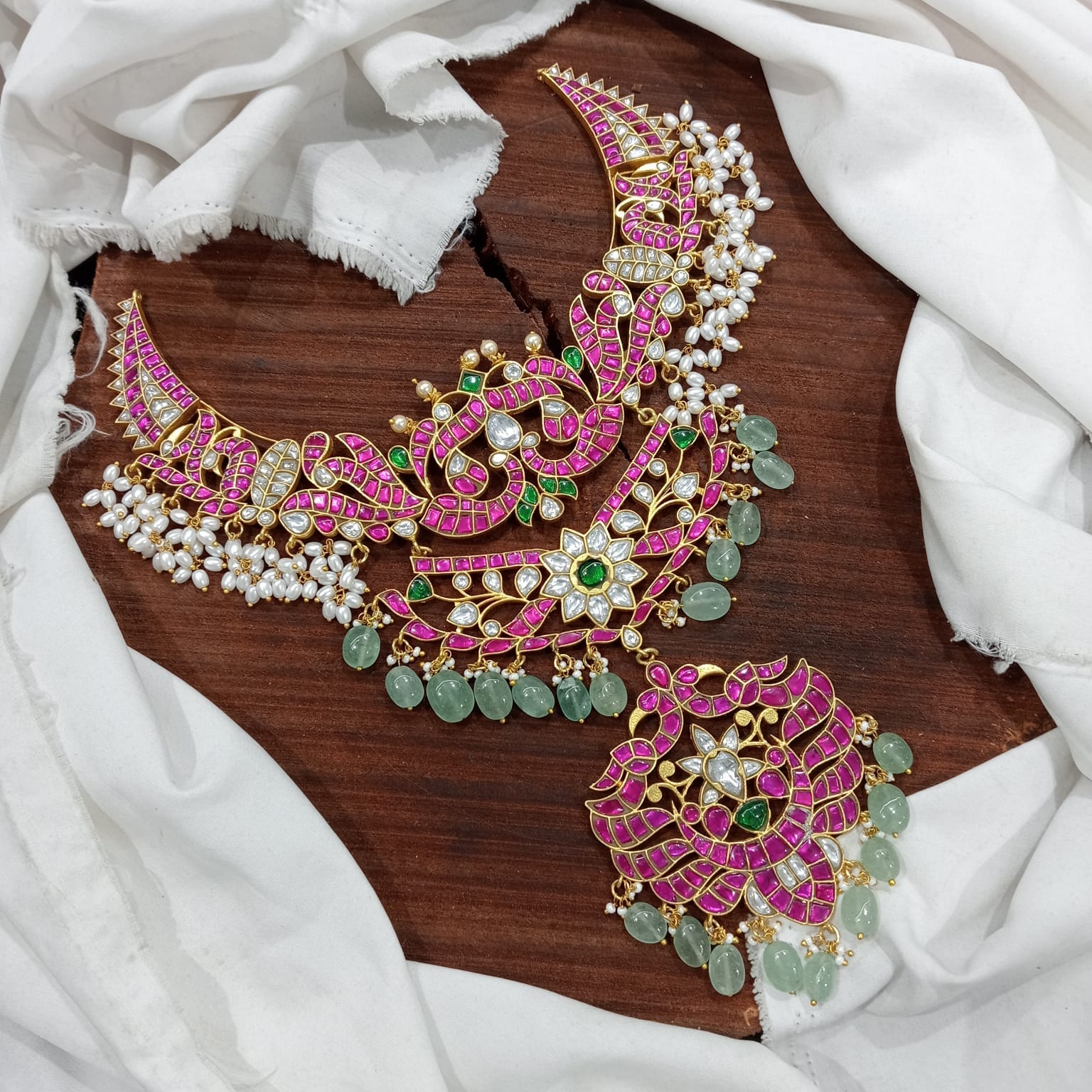 Step into timeless royalty with this handcrafted Jadau necklace featuring vibrant pink stones, radiant emerald drops, delicate pearls, and intricate detailing. A stunning blend of Mughal-inspired craftsmanship and South Indian opulence, this necklace is perfect for weddings, festive occasions, and grand celebrations. The unmissable statement piece that makes you feel like you're part of a legacy — exclusively from Eterna Jewels Designs.