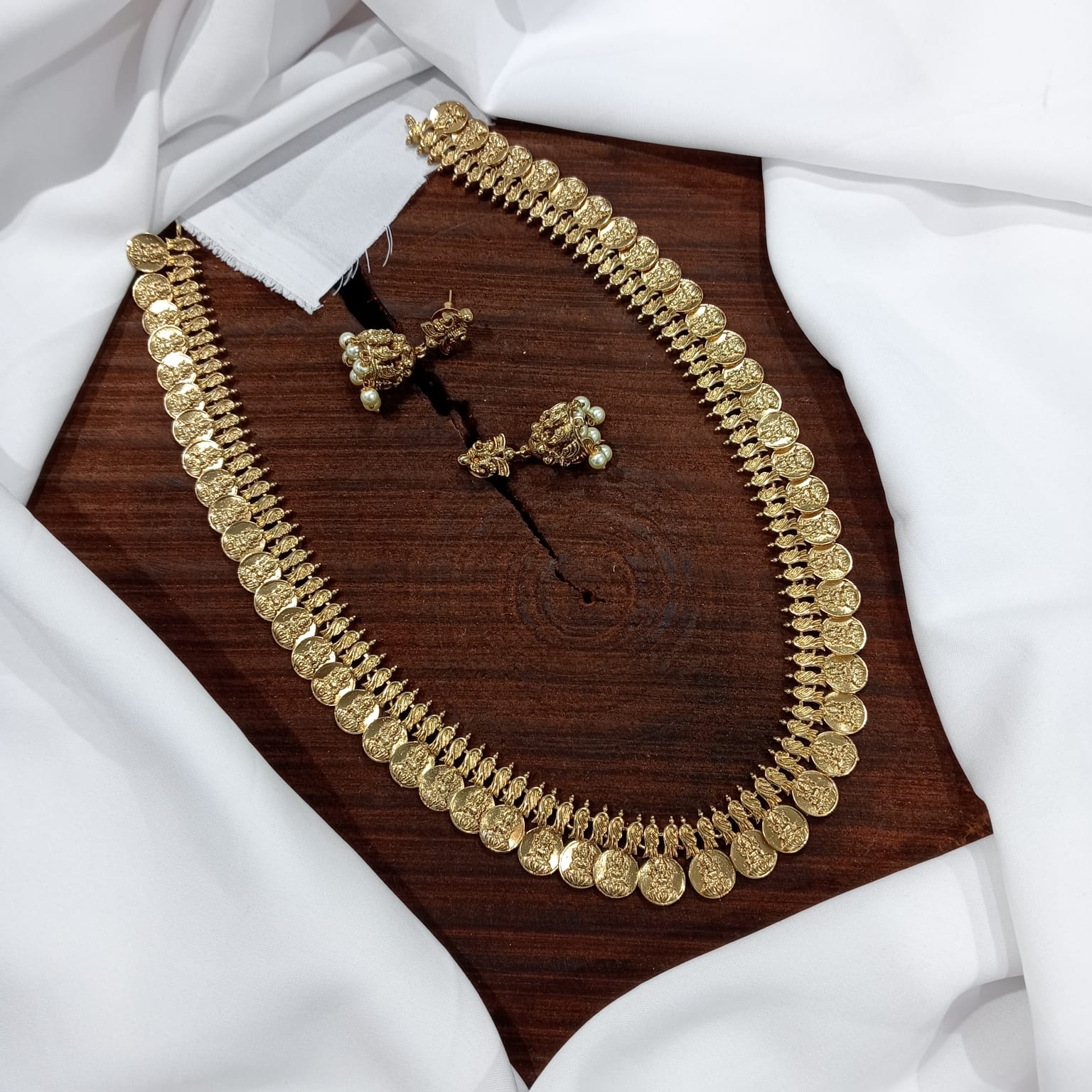 This Lakshmi coin necklace brings out the divine in every woman, making it the perfect choice for weddings, temple wear, and festive occasions. Paired with antique jumkis, it's a graceful nod to tradition. 🌸